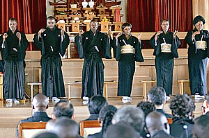 On September 9, Congo Brazzaville Church in the Republic of the Congo conducted a service commemorating its 40th anniversary with the Shinbashira and his wife in attendance. More than three hundred followers from Brazzaville, the coastal city of Pointe-Noire, and the neighboring Democratic Republic of the Congo (formerly Zaire) filled the worship hall of the church. Attending were a number of followers who had walked several days, some from as far away as 250 kilometers (155 mi.). A joyous atmosphere welcomed the Shinbashira and his wife as church members made a pledge to continue their efforts toward spiritual progress. Head Minister Pierre Bazebibaka read the service prayer in French. Along with expressing his joy at being able to celebrate the 40th anniversary of the church in the year of Oyasama's 120th Anniversary, he stated: "The profound love of the Parent has been deeply impressed upon our hearts. The children of the path that have assembled here wish for You to continue to guide us to realize the world of the Joyous Life." Several Yoboku and followers broke down in tears while listening to the prayer, which evoked memories of the years leading up to their 40th anniversary. Following the establishment of the church in 1966, the path in the Congo encountered many severe hardships such as civil wars and successive coups d'Žtat. In January 1998, the then head minister, Rev. Alphonse Nsonga, went to France to undergo medical treatment and, by the end of that year, civil war once again erupted and fighting centered in the neighborhood of the church. Church buildings were damaged and looted. In 2001, Section Chief Toshiyuki Takahashi and staff members of the Europe and Africa Section of the Overseas Department started taking turns in staying at the church to assist church members to rebuild and revitalize Congo Brazzaville Church. Rev. Bazebibaka was installed as the fifth head minister in 2003, and the followers united their minds completely with Jiba and leaned on God the Parent and Oyasama as they headed toward their church's 40th anniversary. Following the reading of the service prayer, the Shinbashira gave an address mentioning that "performing the service" and "engaging in salvation work and spreading the teachings" were duties of all Yoboku regardless of the differences in language or culture. The Shinbashira also stated: "Whether one is a Yoboku or not, it is important for one to settle the use of mind that is in accordance with Oyasama's mind. . . . Although this place is distant from Jiba, Congo Brazzaville Church and Jiba are connected with each other. I ask that you always remember to come to church and keep your minds connected to God the Parent and Oyasama." The seated service was then performed joyously with the Shinbashira and his wife as the center. The seated service was followed by the Teodori, the Dance with Hand Movements, after which Rev. Bazebibaka thanked the Shinbashira and gave the sermon. Performances by the church chorus group and fife and drum corps were then presented. The Shinbashira and Mrs. Nakayama were also present at the inauguration ceremony of the church's chapter of the Boys and Girls Association after the 40th anniversary service as well as at the church's monthly service on the next day, September 10. Also held on the 10th was the 40th anniversary commemorative reception, where chorus groups and the fife and drum corps made another series of performances. The following day, the couple toured the "Congo Brazzaville Ikoi-no-Ie Medical Clinic" and presented donations of medical supplies. They later paid a courtesy call to the prime minister. Inauguration Ceremony for Congo Brazzaville Chapter of the Boys and Girls AssociationOn the afternoon of September 9, following the service commemorating Congo Brazzaville Church's 40th anniversary, an inauguration ceremony for the church's chapter of the Boys and Girls Association (BGA) was held with the Shinbashira in attendance. Some 130 BGA members and 20 adult leaders were present. At the ceremony, the BGA members performed the musical instruments for the singing of the Eight Verses of the Yorozuyo. The Shinbashira then presented the chapter's charter and flag to Head Minister Bazebibaka. The Shinbashira then gave an address. He stated: "The Joyous Life means to live cheerfully while helping and getting along with others in accordance with the wishes of God the Parent. God the Parent works within our bodies and provides the blessings of nature for this purpose and is waiting for the Joyous Life to be attained in this world." He further remarked: "It is my wish for you to become persons that make God the Parent happy by appreciating God's workings, engaging in hinokishin, and helping one another. A Yoboku is a person who puts Oyasama's teachings into practice. It is my deep wish for all of you to participate in the Boys and Girls Association's activities, grow up in good health, and bring joy to your mothers and fathers." Rev. Bazebibaka then expressed his joy at the inauguration of the BGA chapter and resolved to see it mark a new stage for the church. The inauguration ceremony came to a close after all the BGA members cheerfully recited the BGA Pledge in French and sang the song "Minna de tsukuro Shonenkai" (Let's build the Boys and Girls Association together) in Lali, a local language. |