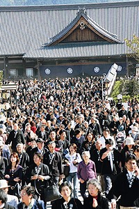 On October 26, the Autumn Grand Service was solemnly performed in the Main Sanctuary of Tenrikyo Church Headquarters with the Shinbashira presiding. With two months remaining before the end of the year of the 120th Anniversary of Oyasama--the year in which Tenrikyo is endeavoring to bring forth the fruits of its pre-anniversary activities in the form of maintaining a lively atmosphere in Jiba--some 74,000 followers from various parts of Japan as well as overseas countries reflected upon the Teaching's Day of Origin and resolved to take a new step forward toward the next milestone. At 8:00 A.M.--the very hour when Oyasama became the Shrine of Tsukihi--the Shinbashira, accompanied by the other Service performers, left the Church Headquarters Staff Quarters to pay respects at the Foundress' Sanctuary and the Memorial Hall. He then proceeded to the Main Sanctuary and ascended the dais. Following a brief silence after the strains of gagaku music ended, he delivered the Service prayer, in which he first expressed gratitude for God the Parent's deep parental heart and boundless blessings. He then said: "Assembled before You are a great number of followers of the path who are putting the finishing touches to their activities befitting this anniversary year and who have returned here from both within this country and from overseas, having looked forward to this day. I pray that You, God the Parent, look upon the way they express their gratitude for Your daily blessings and lean on You while singing the Songs for the Service spiritedly and single-heartedly and that You, too, become spirited." The Shinbashira went on to say, "Reflecting upon the current season and the steps we have taken thus far, setting ourselves a new goal, and making a firm resolution, we Service performers as well as church head ministers and Yoboku are firmly resolved to take ever more powerful strides in advancing world salvation--a mission You referred to as 'endless construction'--and, in order to make a fresh start in this regard, we will be making personnel changes at Church Headquarters." He closed his prayer by saying: "Please continue to guide us with Your boundless parental love so that we may reconstruct the world--in which many people have difficulty in finding a way out of the morass of confusion--as the Joyous Life World even a day sooner, whereby all people help and respect one another." The weather early in the morning was cold enough to make one's breath visible, giving a hint of autumn in the air. When the morning service was over, however, rays of sunshine streamed through the thin clouds. The Home of the Parent was blessed with warm and pleasant weather by the time the Kagura and the Dance with Hand Movements were performed following the prayer. The congregation, filling the four worship halls and the Sanctuary precincts, spiritedly joined in singing the songs for the Service. After the performance of the Dance with Hand Movements, the Shinbashira took the podium to deliver his sermon, in which he expressed his appreciation for the efforts that church head ministers and Yoboku had been devoting to the missionary and salvation work in the lead-up to the anniversary as well as to the promotion of pilgrimages to Jiba during the anniversary year. He then explained how we should spend the remaining two months of this year and spoke about the attitude that would enable us to take the next step forward. Referring to the fact that this day fell upon the fiftieth anniversary of the publication of the Japanese edition of The Life of Oyasama, Foundress of Tenrikyo, he stressed the importance of studying and implementing the Divine Model of Oyasama in our daily lives. Waves of pilgrimage groups returned to Jiba for the Autumn Grand Service. Among them were groups from overseas, comprising 1,421 followers from 21 countries and regions, including the U.S. mainland, Hawaii, Australia, the U.K., New Zealand, South Korea, Taiwan, Brazil, Thailand, and Indonesia. From October 25 to 27, a total of 3,077 people attended the Besseki lectures, of whom 787 were first-timers, and 284 followers received the truth of the Sazuke, the Divine Grant. |