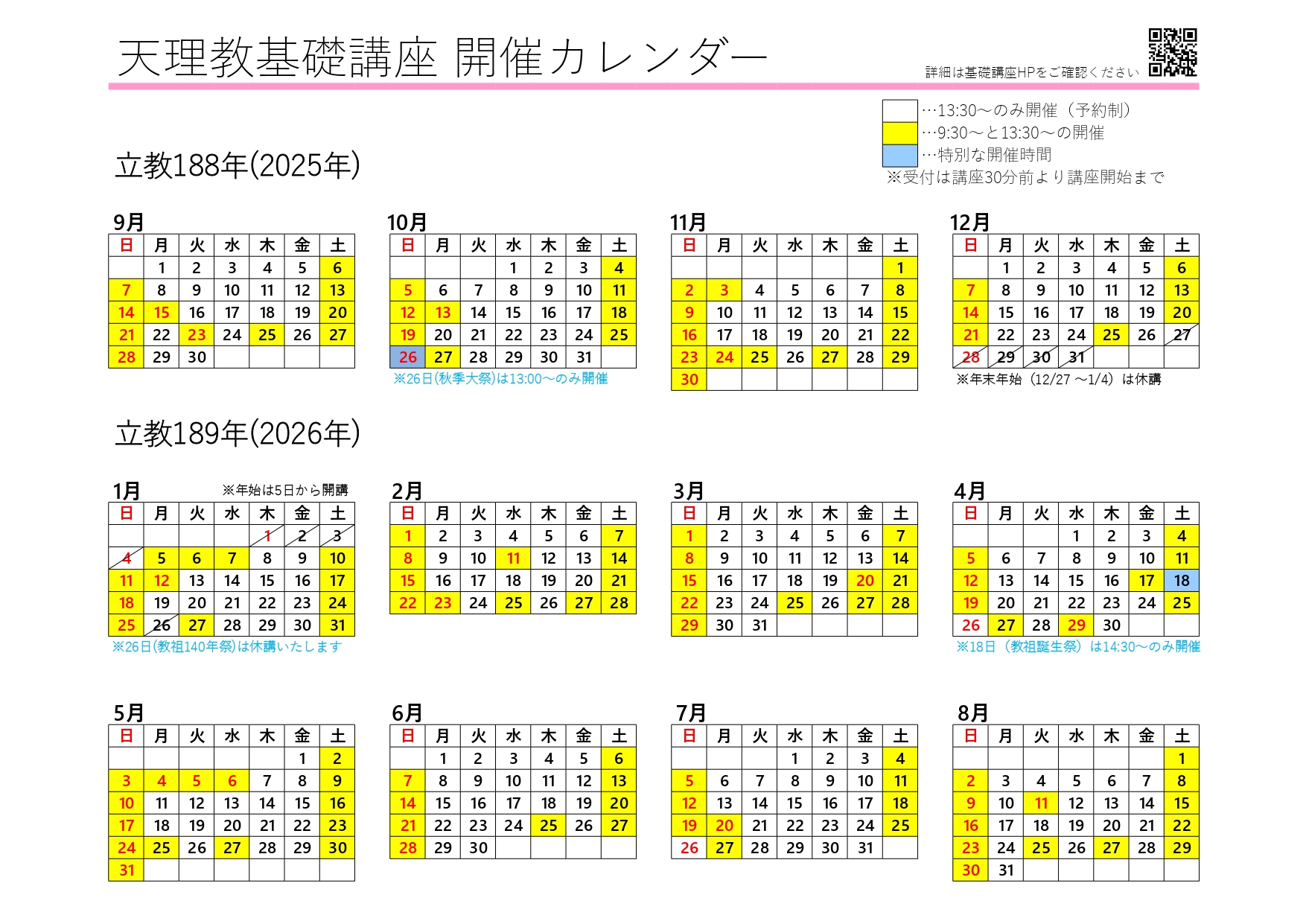 - 土曜日、日曜日、祝日および本部月次祭とその前後(25日〜27日)は予約なしで受講できます。