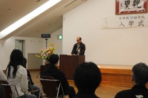 Após o discurso do Diretor Uemura, o vice-diretor do Departamento de Missões Exteriores, Masanao Nakayama, e o presidente da Associação de Responsáveis das Igrejas ligadas diretas a Sede, Motoyoshi Uwasu, proferiram, respectivamente as palavras de felicitações. Representando os novos estudantes, Lee Inhan (Coreia do Sul/Yagi), do curso de Oyassatofussekomi, expressou o desejo e a determinação em relação aos novos estudos.