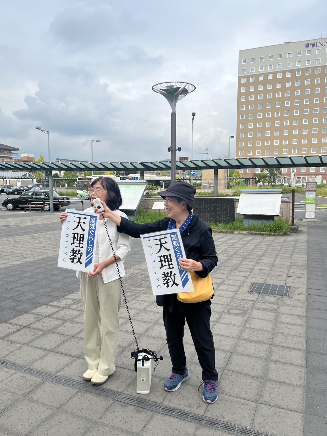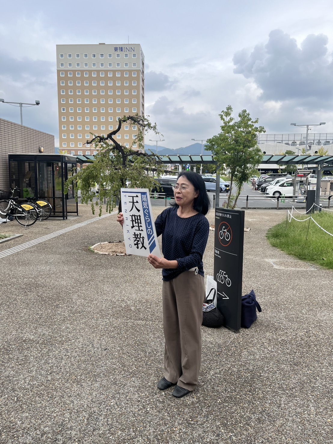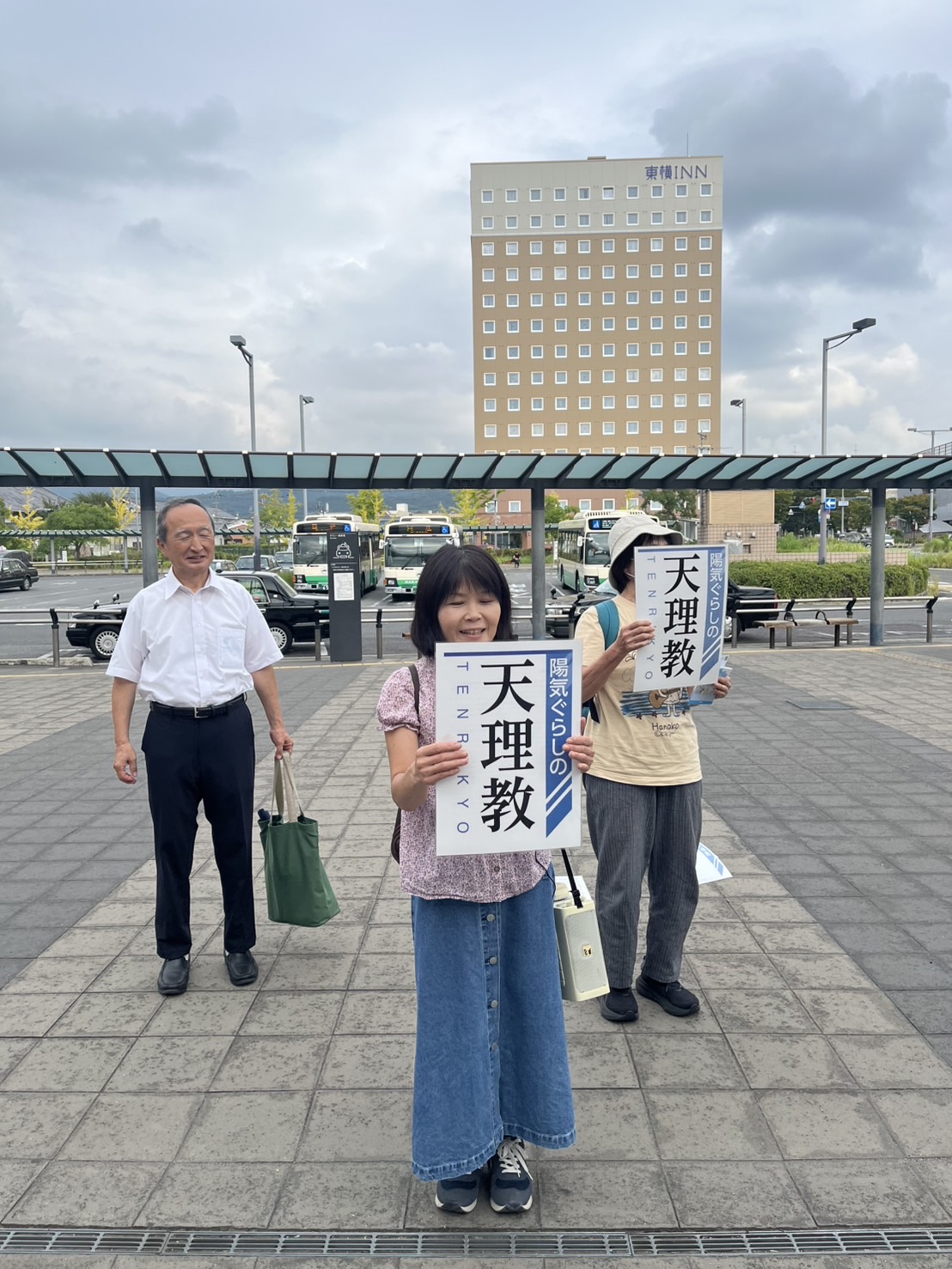 続いて、街頭でのリーフレット配りの際の声のかけ方、表情などにさまざまな工夫をこらして練習をした後、全員で天理駅前へ向かい、3カ所に分かれて路傍講演とリーフレット配りを行った。