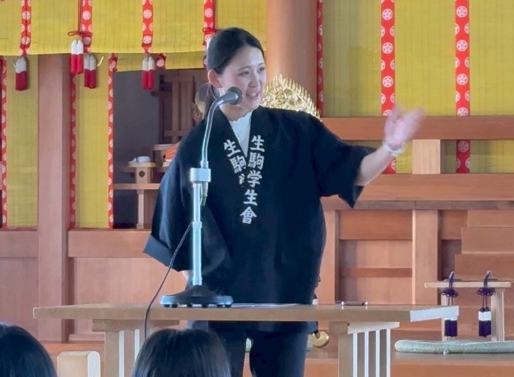 この後、天理教学生会総務の鈴木美来〈みらい〉氏の来賓祝辞、金子実友葵〈みゆき〉・生駒学生会委員長のあいさつ、生駒学生会のPR動画の視聴と進んだ。