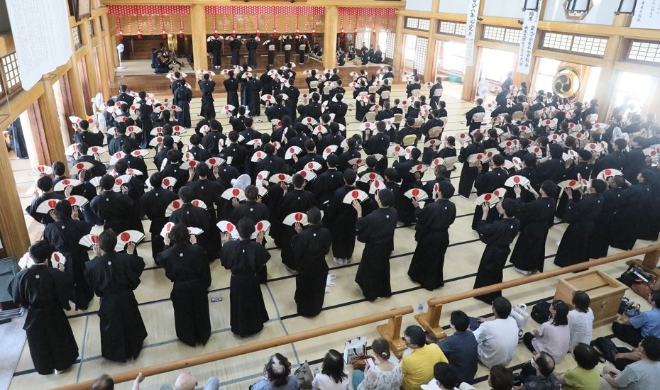 当日は、同じく「女子青年大会」を開いた女子青年109人と共に、祭典の部が行われ、全員で座りづとめとてをどりまなびを勤めた。