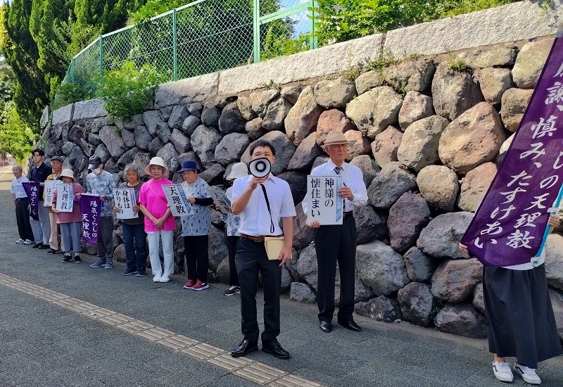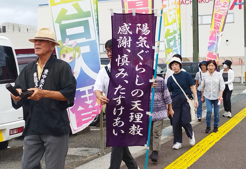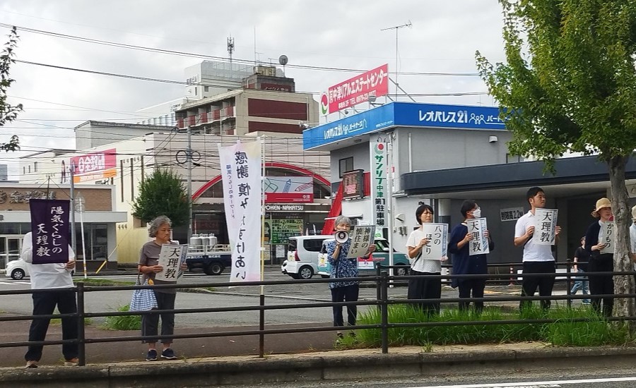30日は15人が教務支庁に集合。午前は支庁内で除草作業し、午後は支庁前で路傍講演した。