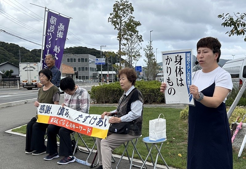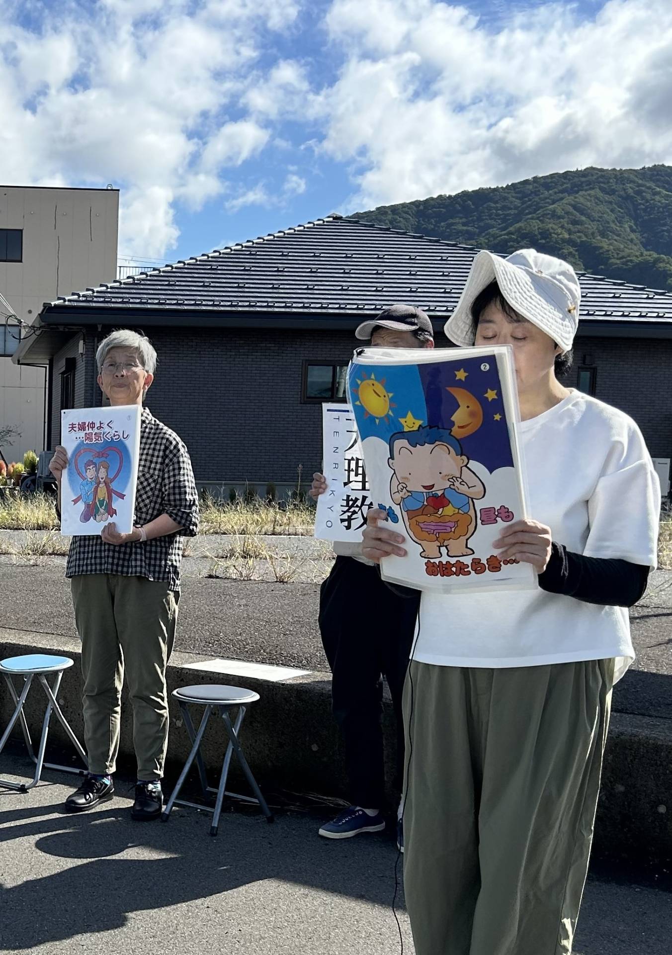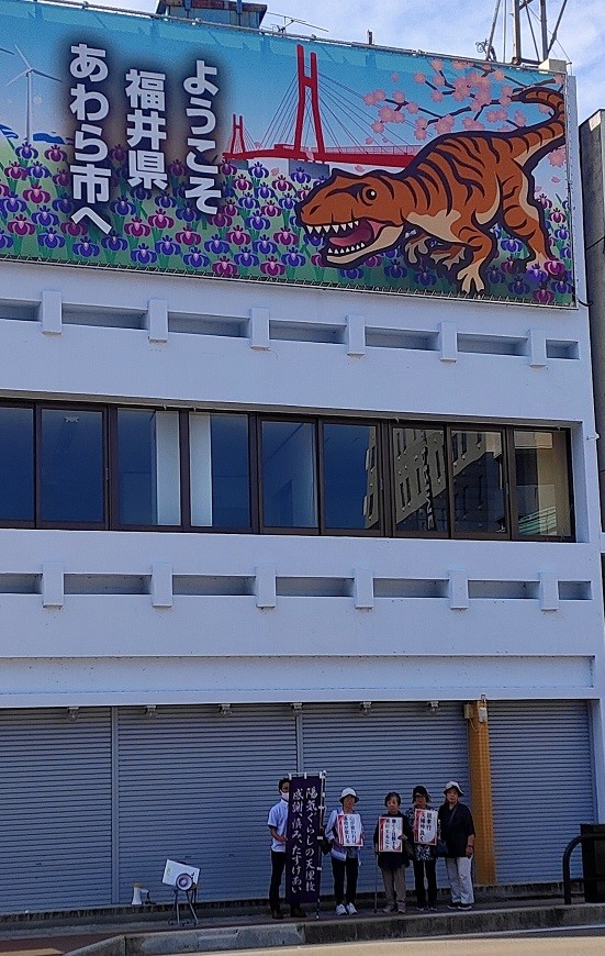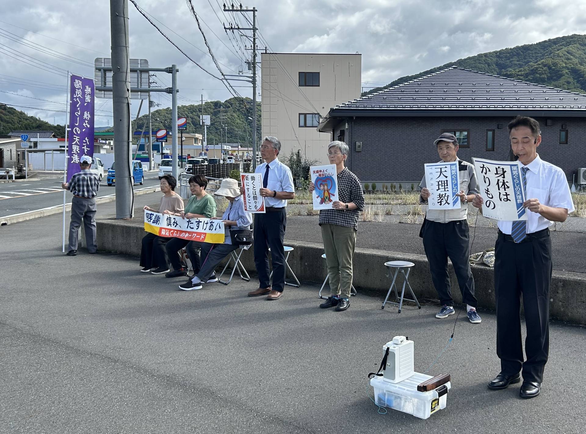 坂井支部は9月28日、あわら市の北陸新幹線芦原温泉駅前で路傍講演を実施、9人が参加した。