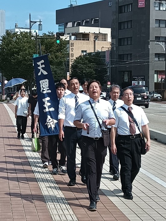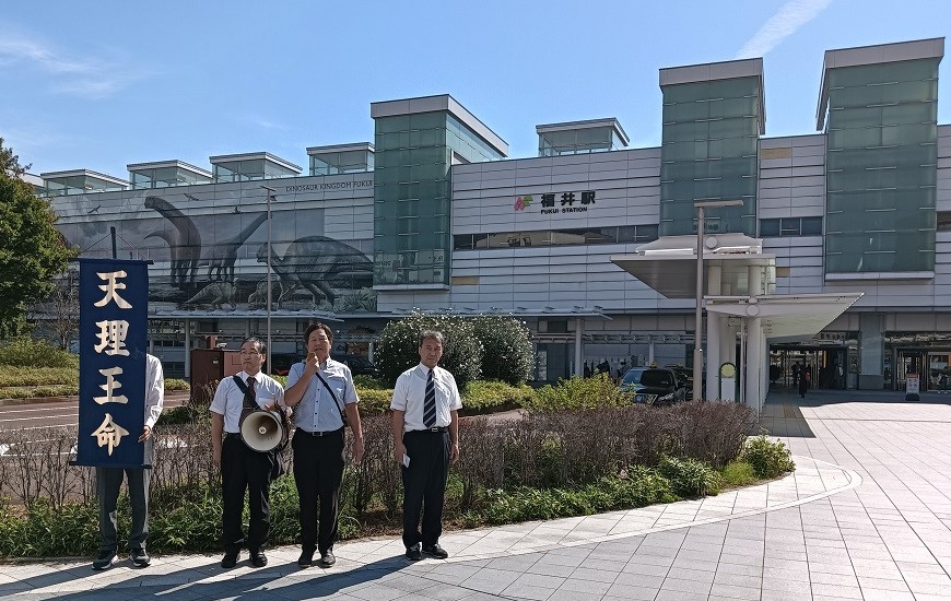 最初に、同教会でおつとめを勤めた後、神名流しで福井駅へ向かった。駅の東西に分かれ路傍講演。リーフレット配りやごみ拾い、にをいがけに勤しんだ。