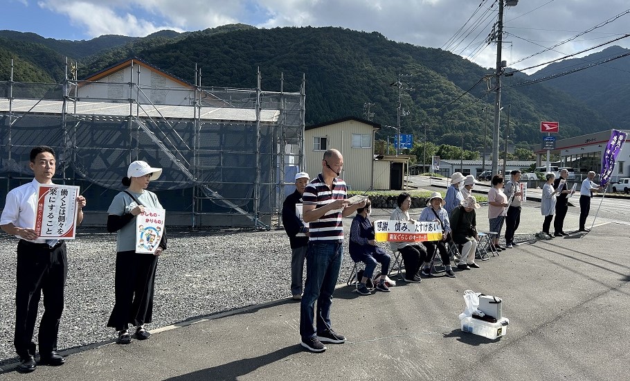 29日は、敦賀市内での戸別訪問と、美浜町内の道の駅周辺で路傍講演およびリーフレット配りを実施。合計50人が実動した。