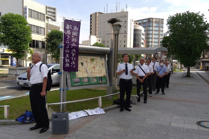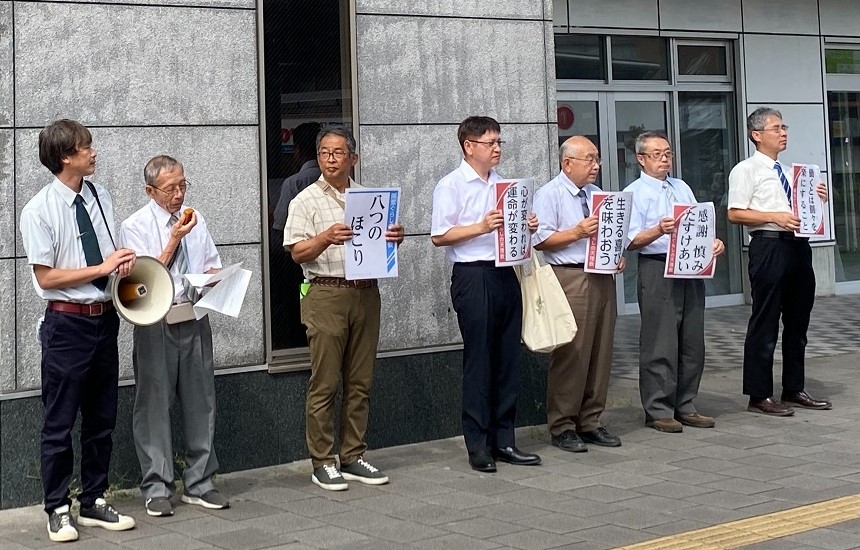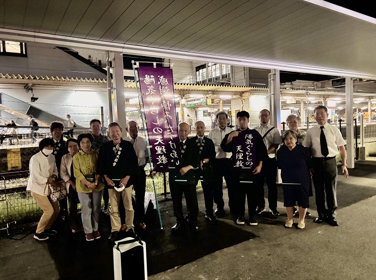 両日とも、「よろづよ八首」の奉唱と路傍講演を実施。残暑厳しい中、参加者たちは駅前を行き交う人にお道の教えを伝えた。