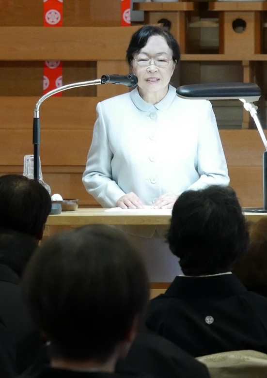 続いて、中村陽子・本部派遣講師(大美國分教会前会長夫人)が「楽しく信仰生活を送って頂きたい」の題で講話した。