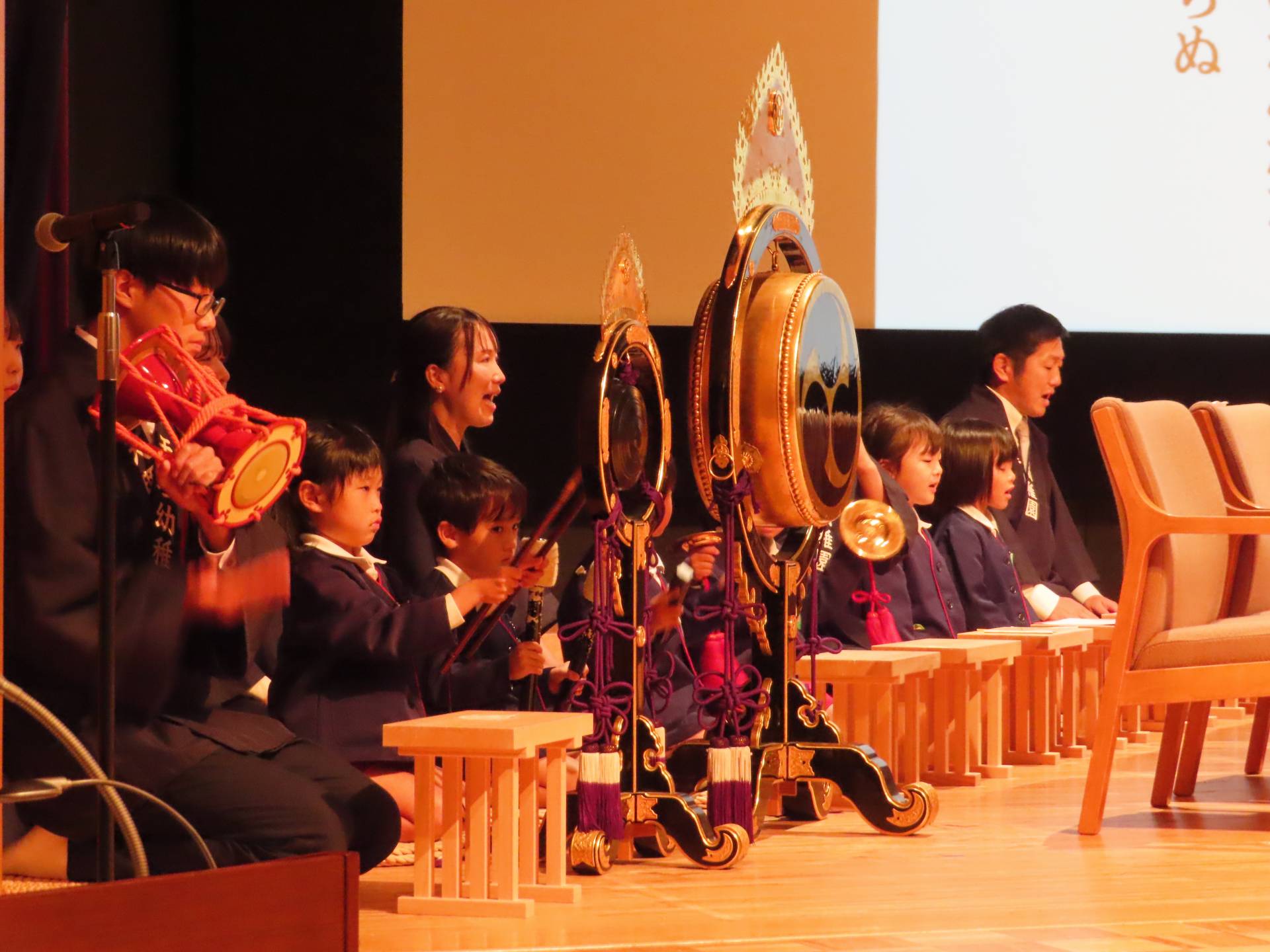 式典では、年長児の代表が地方や鳴物をつとめ、みんなで「よろづよ八首」を奉唱しました。