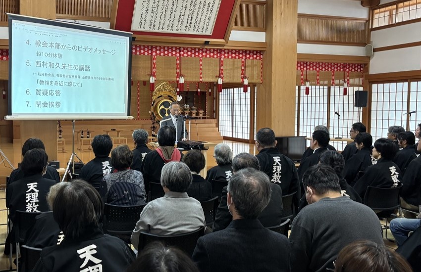 当日、開講あいさつに立った上林敏晴・教区主事は、秋季大祭での真柱様のお言葉を引いて「残り85日、精いっぱいつとめさせていただこう」と述べた。その後、日ごろの御礼と人さまのたすかりを願う「おたすけお願い用紙」を神前に供えて、おつとめを勤めた。