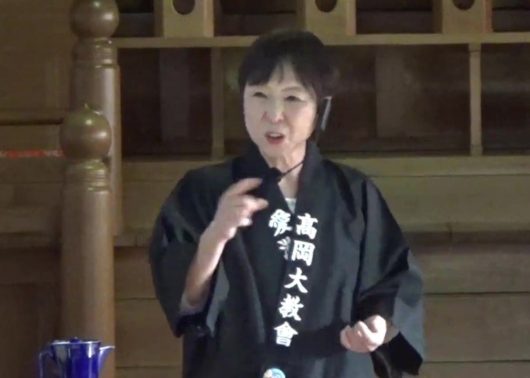 講演では、同番組への出演の紹介とともに、会長夫人として、にをいがけやおたすけに勤しむ日々や、これまでに神様からお見せいただいた不思議なたすけ、珍しい御守護の数々の話を、時折ミニ仮装を交えながらユーモアたっぷりに語った。