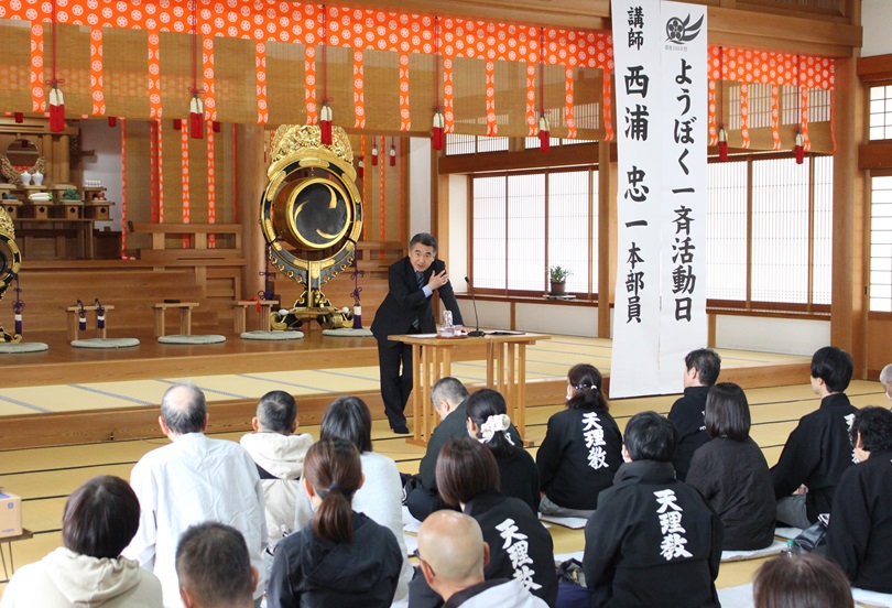 「教祖におよろこび頂ける歩みを」と題した講話の中で西浦氏は、教えの要点を体験をもとに語った。 特に、世界たすけの重要な手段であるおつとめについて、「教えられた通りに勤めることで、をやに喜んでいただける」と強調したうえで、具体的なポイントを示した。