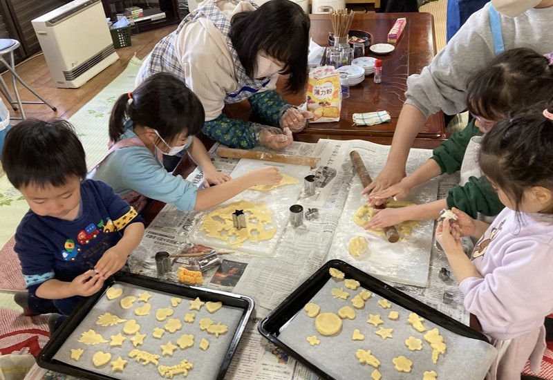 当日は、ひのきしんとして教会周辺のごみ拾いを実施。その後、おやつのクッキー作りでは、少年会員もクッキー生地の片抜きを手伝った。また、昼食は手作りのちらし寿司と豚汁を頂いた。