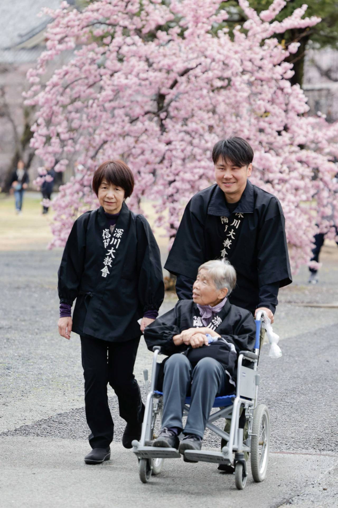 - 桜花爛漫の参道を通り、本部神殿へ向かう参拝者たち(3月26日)