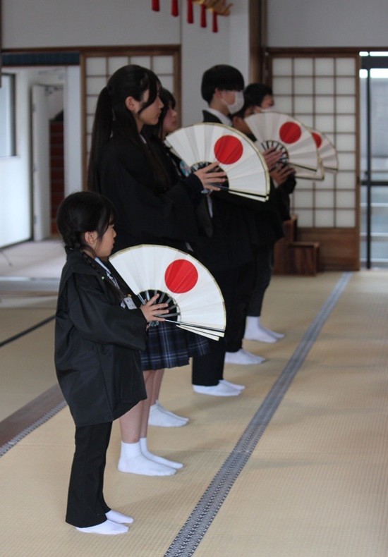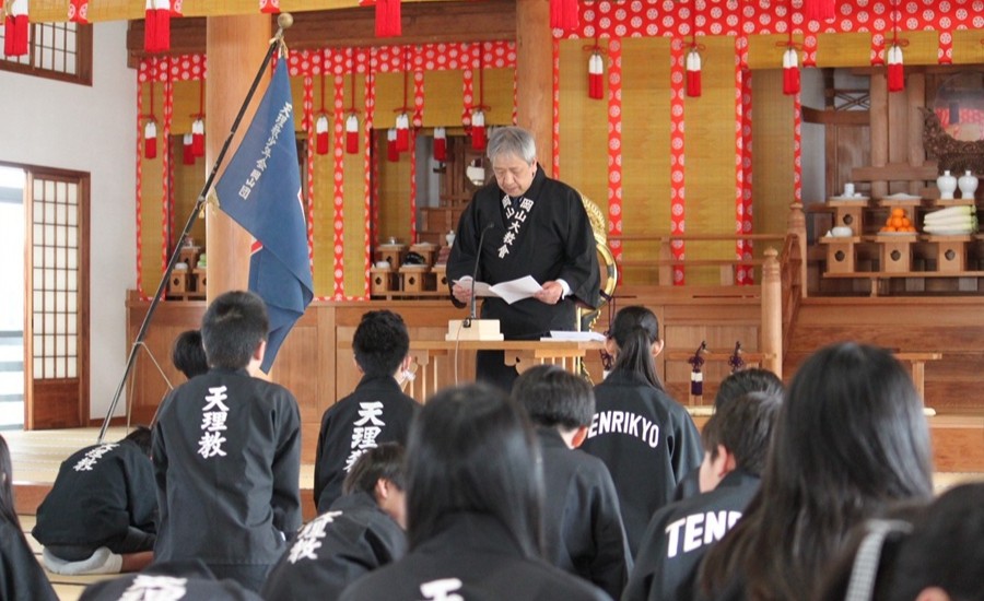 式典では、中山善司・少年会長の告辞を代読後、長﨑憲治・育成会長があいさつ。長﨑育成会長は「声を出し、呼吸ができることも、空気や風のおはたらきである」と、十全の守護の「かしこねのみこと」のお働きを分かりやすく説いたうえで、「周りの友達を元気にして、神様が喜んでくださるような言葉を使ってほしい」と励ました。